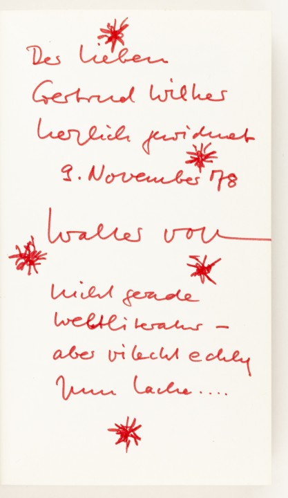 Ausländer, Rose. Noch ist Raum. Gedichte.128 SS. 8vo. Orig.-Ppbd. – Duisburg, Gilles & Francke, 1976. Erste Ausgabe. Nachwort von Hans Binder. Mit eigenh. Widmung der Verfasserin (1901–1988) „dem lieben Wolfgang Ratjen mit herzlichen Weihnachts- und Neujahrswünschen Rose Ausländer. Düsseldorf, Dezember 1976“. Der aus einer rheinischen Industriellen- und Bankiersfamilie stammende Wolfgang Ratjen (1943–1997) war Kunstsammler. Seine bis heute bestehende Stiftung richtet jährlich Stipendien an herausragende Forschungsarbeiten auf dem Gebiet der grafischen Künste aus. – Wilpert/G. 8. – Gering gebräunt. Sauber. – Best.-Nr. 27242 |