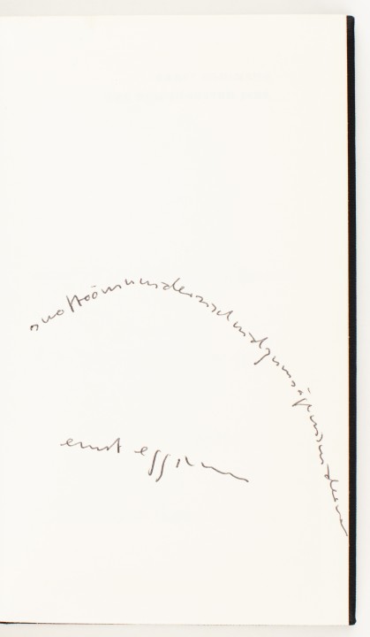 Eggimann, Ernst. vor dem jüngsten Jahr. Erzählungen.169 SS., 1 Bl. 8vo. Orig.-Ln., Schutzumschlag nach einem Entwurf von E. E. – Zürich, Arche, 1969. Erste Ausgabe. Mit eigenh. Zitat und Unterschrift des Verfassers (1936–2015) „swottoömuwidersischnidzumsägewiswiderwott ernst eggimann“, Das Zitat stammt aus Eggimanns erster berndeutschen Gedichtsammlung „Henusode“, die im Jahr zuvor ebenfalls bei Arche erschienen war. – Sauberes Exemplar. – Best.-Nr. 27236 |