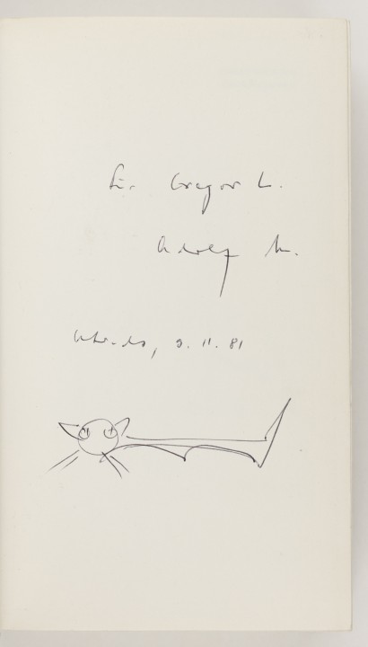 Muschg, Adolf. Gegenzauber. Roman.486, (1) SS. 8vo. Orig.-Ln., Schutzumschlag. – Zürich, Die Arche, (1967). Erste Ausgabe. Mit eigenh. Widmung des Verfassers (geb. 1934) „Für Gregor L. Adolf M. Utrecht (?), 9.11.81“, begleitet von einer kleinen Katze in Kugelschreiber – Best.-Nr. 27265 |