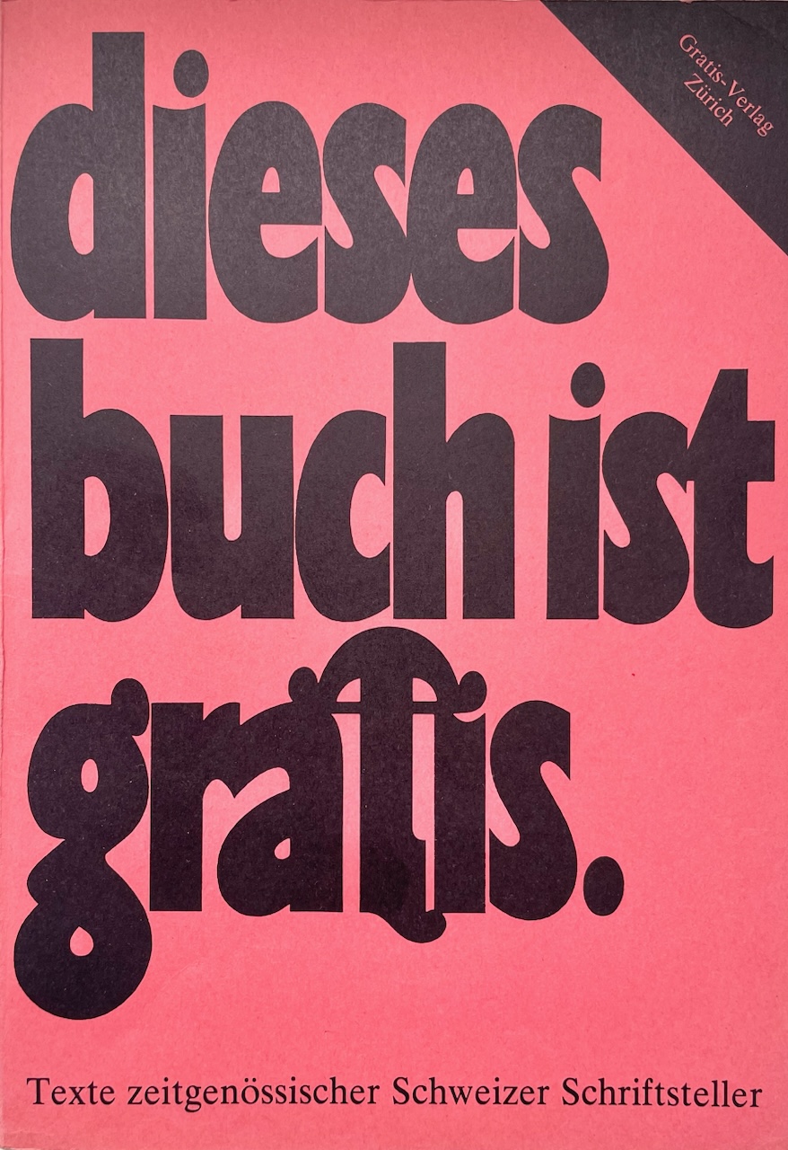 1971 erschien, herausgegeben von Theo Ruff und Peter K. Wehrli, das «Gratisbuch» in einer Auflage von 40’000 Exemplaren. Die Anthologie mit Beiträgen von Vertretern der damaligen progressiven Schweizer Literaturszene wie Peter Bichsel, Erika Burkart, Max Frisch, Adolf Muschg, oder Paul Nizon u.v.m. wurde in den Städten und Dörfern, auf Strassen und Plätzen, in Kneipen und Zügen gratis verteilt. Das Echo auf die ungewöhnliche Buchpublikation und die Verteilaktionen war riesig. Nicht nur in Schweizer, auch in ausländischen Medien wurde darüber berichtet